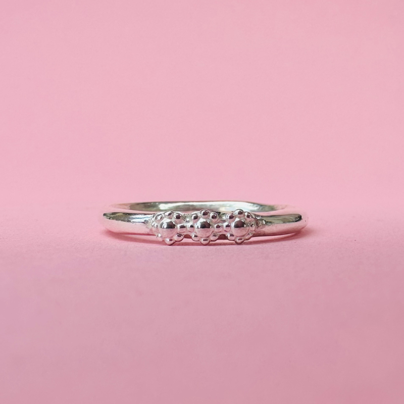 Prachtige zilveren ring die niet perfect recht is, beetje chunky met drie prachtige bloemetjes erop. Superleuk als enkele ring maar ook om te combineren met een andere ring. Liever gouden bloemetjes? Dat kan! Stuur me een berichtje