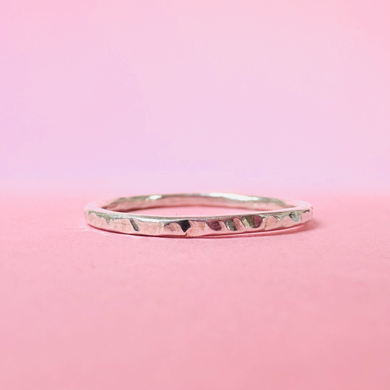 Een fijne zilveren ring met een grove hamerslag. Ring is 1,5 mm breed. Mooi glanzend, perfect om te combineren met een andere ring.